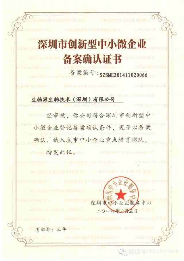 生物源通過深圳市創(chuàng)新型中小微企業(yè)備案